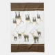 This kitchen towel is shown in golden brown and white colors with tan accent stripes over chocolate brown. Several deer in multi-brown tones with treed landscape shadowing on their bodies grace both ends of this towel. Over white background.