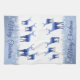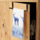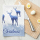 This kitchen towel is shown in wintery blue and white colors with a blue/white snowflakes scene. Several deer in blue tones with wintery scenes shadowing on their bodies grace both ends of this towel. Text of Merry Christmas in deep Sapphire blue over white background.