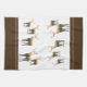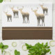 This kitchen towel is shown in golden brown and white colors with tan accent stripes over chocolate brown. Several deer in multi-brown tones with treed landscape shadowing on their bodies grace both ends of this towel. Over white background.