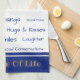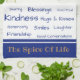 This kitchen towel is shown in sapphire blue and white with camel tan accent and accent stripes. Uplifting words of "Sharing, blessings, good food, kindness, hugs & Kisses, generosity, smiles, laughter, friendship, good conversations", and, at the bottom of the towel " the spice of life". Over white background.
