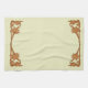 Bracket of angled "wrought iron" leaf pattern is replicated in four corners. Image is shades of brown on a light yellow/green background.