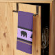 This kitchen towel is shown in a cute lodge style print of bears and fir tree icons in black silhouettes over lavender and black stripes and royal purple and tan color stripes towel.