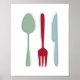 This retro kitchen art print will look adorable in any home, with it's kitchen utensils (fork, knife and spoon) in a combination of blue, green, orange, and red with thin black lines.