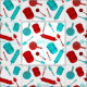 Our original kitchen utensils and accessories pattern in red and aqua on a white background. Original design by Holiday Hearts Designs (all rights reserved).