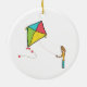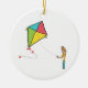 Kite flying on a windy day. Kite with ribbon tail flies high in the air and down on the ground is a kite flier. The joy of flying a kite in a simple illustration.