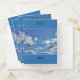 Kites flying high over the water in the blue sky with big white fluffy clouds. Light blue border.
