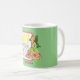 Kitschy & cool mug for Mahjong lovers features vintage costumed fairy cutout, mahjong tiles and "mahjong queen" text on light green background. Personalize with name or monogram