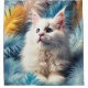 A fluffy kitten gazes upward with soft fur illuminated by gentle light, surrounded by airy feathers in cool blue and warm golden tones. The delicate textures and dreamy color blend create a serene, enchanting composition that feels light, graceful, and visually captivating.