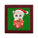 Cute Kitten Santa with big blue Eyes holding a Big Red Christmas Gift