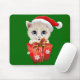 Cute Kitten Santa with big blue Eyes holding a Big Red Christmas Gift