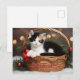 An adorable Christmas Postcard that will make anyone smile. Kitten sitting pretty in a wicker basket that is decked in holiday garland. Send one to your friends this season.
