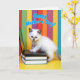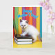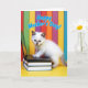 The front design shows a fluffy cream-colored kitten with slightly darker tips on its ears and nose, gazing forward with bright blue eyes and a curious, affectionate look ❤️. Its tiny paws rest on the keys of an open black laptop, as if it’s typing a sweet note to someone special. The laptop sits on two stacked hardbound books, with a calm blue cover on top and a black one beneath, all placed on a sunny yellow surface. Behind the kitten, tall vertical stripes in red, green, purple, orange, and blue create a cheerful, party-like backdrop, while the soft lighting makes the fur look extra plush. Near the top of the card, the message “Happy Mother’s Day!” appears in sky-blue lettering with a thin white outline, centered and easy to spot. The kitten’s gentle posture and attentive eyes add a tender, friendly mood, like a small companion helping send love 🌼. The scene is framed by the rainbow-like striped background, with the blue text floating above the kitten’s head.