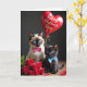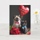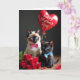 Designed with two young cats as the focus, the scene rests on a warm, polished wooden tabletop that feels cozy and intimate. The kitten on the left has creamy fur with warm brown shading and darker points, gazing forward with bright blue eyes and a small pink bow tie that adds a sweet, affectionate touch ❤️. Beside it sits a darker kitten in deep charcoal-brown tones, meeting the viewer with the same blue-eyed stare and a soft blue bow tie, like a quiet companion leaning into the moment. In the upper right, a red heart-shaped balloon floats against a dark, softly blurred background, with a short message printed across it in white letters. Near the lower left corner, a cluster of fresh red roses lies on the wood, the petals tight and velvety, suggesting a gentle kind of closeness between the pair 🌼. A few loose petals are scattered nearby, adding small pops of red that echo the balloon above. Soft lighting highlights the kittens’ fur and the sheen of the tabletop while keeping the background subdued. The heart balloon sits high to the right, the roses rest low to the left, and the two bow ties—pink and blue—stand out clearly against their fur.