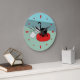 This cute clock has a cartoon of a kitten riding a robot vacuum.