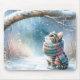 A cute cat sits in the snow wrapped in a colorful scar as it gazes up at the falling snowflakes