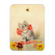 Magnet featuring Meta Plückebaum’s artwork Kitten with a Red Ribbon (b. 1876). A grey kitten with dark stripes is beautifully adorned with a red ribbon. The kitten plays with a bee. Yellow flowers decorate the foreground. A wonderful gift for cat lovers and German art enthusiasts!