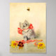Poster featuring Meta Plückebaum’s artwork Kitten with a Red Ribbon (b. 1876). A grey kitten with dark stripes is beautifully adorned with a red ribbon. The kitten plays with a bee. Yellow flowers decorate the foreground. A wonderful gift for cat lovers and German art enthusiasts!