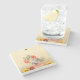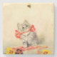 Stone Coaster featuring Meta Plückebaum’s artwork Kitten with a Red Ribbon (b. 1876). A grey kitten with dark stripes is beautifully adorned with a red ribbon. The kitten plays with a bee. Yellow flowers decorate the foreground. A wonderful gift for cat lovers and German art enthusiasts!