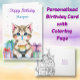 Cute birthday card for girls. Cute for a child or adult. A kitten holding a birthday cupcake surrounded by gifts. You can customize the card by adding a name in the personalize area. Cute puppy and birthday pun inside along with a coloring page. Cute pink, purple, green and blue.