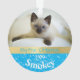 Celebrate your kitten's first Christmas with this personalized ornament. With a background of blue with white snowflakes and a gold stripe, just add your cat's name and the year along with two photographs or your cute little feline!