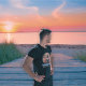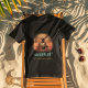 Kitty Buccaneer's Sunset Quest T-Shirt: A black cat, dressed as a pirate, is holding a treasure map and standing on a retro sunset.