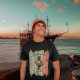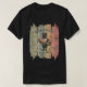 Kitty Buccaneer's Sunset Quest T-Shirt: A black cat, dressed as a pirate, is holding a treasure map and standing on a retro sunset.