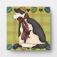 Green, blue, plaid background with folk primitive illustrated black and white cat trimmed with balls of yarn and hearts. Decorative and useful unique gifts for her. Cat and yarn trim illustration by Trina Clark. Design by Deborah Miller.