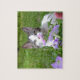 Pretty tiger and white kitty cat and pink/purple petunias in this puzzle