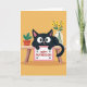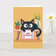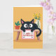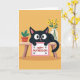 This card features a stylized black cat with big white eyes, a small pink nose, and a gentle smile that feels like a friendly, affectionate glance ❤️. The cat sits on a pale wooden surface, its sleek shape standing out against a rich golden-orange background that adds a sunny warmth. In its paws, it hugs a rectangular sign as if holding it close like a treasured note from a friend. The sign has a pink border with lighter dot details, and small dark paw prints decorate the edges. The main message is placed in the center of the sign in red lettering, easy to spot at first look. On the left side of the scene, a small pot holds leafy green foliage, balancing the layout with a calm touch. On the right, a clear vase displays bright yellow flowers with deep red centers, like little sunbursts 🌼. The warm orange backdrop fills the space behind the cat, with the pale tabletop running along the bottom edge.