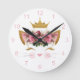 Sweet girl's room decor wall clock done in white with graphics of a cute kitty face with pink nose, golden eye lashes, ears and crown and pink flowers on her head. Pink numbers go around the perimeter of the clock. Customize to add your own text to this pretty clock. Matching girls bedroom decor is available.