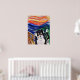 A lighthearted comical tribute to the stress of life. The swirling sky and sea capture the haywire moment when you realize that you just lost any illusion or hope of control. Inspired by Edvard Munch's, "The Scream." Rendered in gouache.