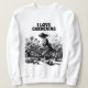 kneels in a garden sweatshirt