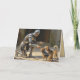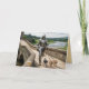 A cute dog greeting card featuring a knight in armor walking his small dogs by a castle.