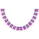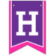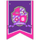 Knights medieval shield themed pink and purple Happy birthday flag party bunting. Personalize with your child's birthday year. Currently reads Happy 8th Birthday. Matches other items in the princess knights medieval shield girls collection. Features a regal shield in purple and pink with a unicorn head, star, age number and princess crown design. All original art and design by Sarah Trett. www.sarahtrett.com for www.mylittleeden.com