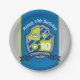 Boys knights medieval shield birthday party disposable party paper plates. Personalize with your own birthday boys name and age. Currently reads Happy 10th Birthday Christopher. Ideal for childrens knight and maidens birthday parties. Matches other items in the knight shield medieval party blue, green and gray range. Original art and design by Sarah Trett. www.sarahtrett.com for www.mylittleeden.com