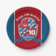 Boys knights medieval shield birthday party disposable party paper plates. Personalize with your own birthday boys name and age. Currently reads Happy 10th Birthday Benjamin. Ideal for childrens knight and maidens birthday parties. Matches other items in the knight shield medieval party blue, red and gray range. Original art and design by Sarah Trett. www.sarahtrett.com for www.mylittleeden.com