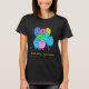 A flock of funny, fluffy, coloured lambs decorates the front of this black t-shirt that is designed to be worn by anyone who loves knitting and / or sheep. There are 8 sheep in bright shades of blue, green, pink and yellow, two of which have balls of yarn attached. Below is written "Knit one. Purl one." in yellow text.