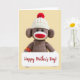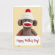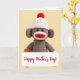 This card shows a front-facing knitted plush figure centered on a soft pale yellow background, giving the scene a gentle, affectionate mood ❤️. The small character is textured brown with round ears and short limbs, and its creamy white face patch frames a stitched red smile that feels like a friendly grin. A white knit beanie sits snugly on its head, topped with a fluffy deep-red pom‑pom that mirrors the smile for a sweet, cozy touch. Shiny black button eyes look straight ahead, creating the sense of a warm, attentive presence, like it’s sharing a quiet moment with someone it cares about. Across the lower body, it holds a white rectangular sign with rounded corners, like a little note offered with care 🌼. Near the center of that sign, the message “Happy Mother’s Day!” appears in flowing red lettering, standing out clearly against the white. Soft, diffused lighting highlights the yarn texture and the fuzzy pom‑pom, while the plain yellow backdrop keeps all attention on the character and its sign. The red words sit neatly on the white sign held across the plush figure’s front, with the sign’s rounded corners clearly visible.