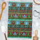 This original holiday kitchen towel has a festive pattern made to resemble a knitted Christmas sweater. It includes reindeer, trees, mountains, snowmen, mistletoe, snowflakes, birds and more. The colors are all pretty shades of red, green, blue and golden yellow. This unique, custom Christmas design is perfect for the holiday season.