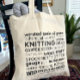 This handy tote bag features a collage of common knitting terms and abbreviations such as: cast on, stitch markers, K2tog, in the round, gauge, WIP (work in progress), and stockinette stitch. This project bag makes a thoughtful gift for any knitter! See all of Mary Lee's knitting patterns at FiftyFourTenStudio.com.