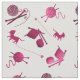 Knitting themed fabric for sewing and crafts. Wine red and pink shades over light gray background, this fabric comes in cotton, linen, polyester and more. Knitting needles, yarn graphics, and cats pulling a ball of yarn, make up this fun pattern.