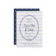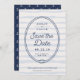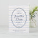 Announce your wedding to family and friends with these coastal chic save the date cards in shades of navy and light blue. Design features a knotted nautical rope oval with "save the date" and your wedding details inside. A wavy blue striped background completes the look. Cards reverse to a pattern of white anchors on navy blue.