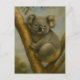 This serene wildlife art print captures a koala perched peacefully on a tree branch, its limbs gently gripping the bark as soft light filters through the forest canopy. The detailed fur texture and expressive gaze evoke a sense of quiet awareness, while the warm and cool tones of the background suggest a tranquil moment in nature’s embrace.