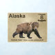 Another in the series of postage stamps for a hypothetical independent nation of Alaska. Features a digital painting of a Kodiak Bear on a neutral parchment, or old paper, background. Text reading "Alaska," "Postage 8 Nuggets," and Kodiak Bear Ursus arctos middendorffi" also appear. The Kodiak Bear (Ursus arctos middendorffi), a subspecies of the brown, or grizzly, bear are the world's largest bears. A full grown male can be over ten feet tall when upright on his hind legs and weigh over 1500 pounds - truly a sight to behold. One bear in the Bismarck, North Dakota zoo was estimated to have weighed as much as 2400 pounds. The bears live on the islands of Alaska's Kodiak Archipelago. Today there are approximately 3500 Kodiak bears and their numbers are increasing due to the generally excellent condition of their habitat including sufficient fist to eat. They are called "takuka-aq" in Alutiiq, the language of the people's native to that area. The bears are believed to have been isolated there since toward the end of the last Ice Age over 12,000 years ago. Though they are the largest terrestrial carnivore their diet includes large amounts of grass, other plants and berries. Today there are approximately 3500 Kodiak bears and their numbers are increasing due to the generally excellent condition of their habitat including sufficient fish to eat. Due to the abundance of food resources Kodiak bears have smaller home ranges than any other brown bears and have no need to defend territories. The Alutiiq people hunted bears for food, clothing and tools. Arrows, spears, and a great deal of courage were required hunting equipment. Bear heads were usually left in the field as a sign of respect to the spirit of the bears.