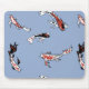 Features a graphic design of koi carp against a blue background, based on traditional Japanese art. The fish are ornamental animals often kept in ponds in oriental gardens, and they can symbolize romantic love, affection and friendship, because the word "koi" in Japanese is pronounced the same as another word that means "love".