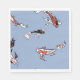 Features a graphic design of koi carp against a blue background, based on traditional Japanese art. The fish are ornamental animals often kept in ponds in oriental gardens, and they can symbolize romantic love, affection and friendship, because the word "koi" in Japanese is pronounced the same as another word that means "love".