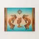 Enjoy this Unique Southwest Kokopelli Puzzle! It Features Two Copper Southwest Kokopelli Dancing and Playing the Flute around a Cactus Under the Sun on a Turquoise and Orange Sunset Background...Surrounded by Copper Borders!