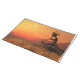A giant stone Kokopelli statue sit on some rocks in a desert. The red sunset illuminates the arid valley which is filled with yellow grasses and cacti. The right side of the image is dominated by rocky mesas.