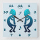 In brilliant shades of aquamarine blue, Kokopelli plays with musical notation symbols around. Find a vibrant wall clock for your music room or any place where nature and music are appreciated.
