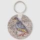 This Keychain features a bird perched on a branch in the form of a mosaic of small colorful tiles. The bird's feathers are in light and dark hues of blue and gray. Its under body and throat consists of orange and red tiles.